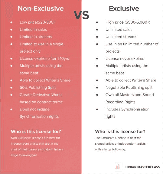 n the image below you’ll find a summary and comparison between Non-Exclusive and Exclusive Beat Licensing. Please note that the Non-Exclusive ‘Sales’ and ‘Streams’ limit does not apply to the “Unlimited” licenses.