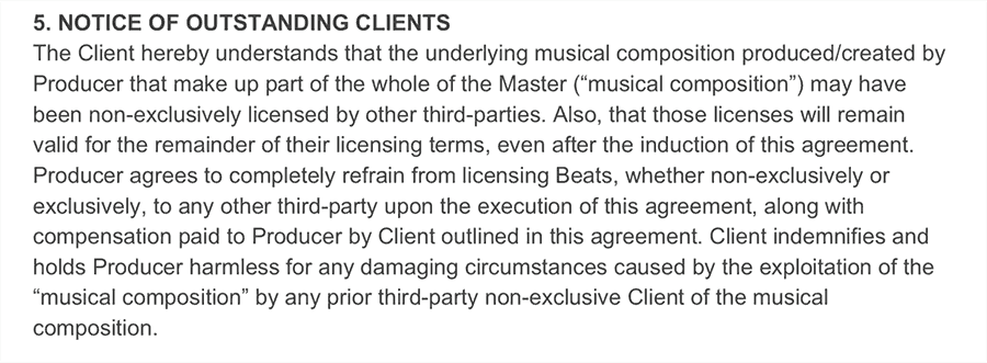 With a non-exclusive license, the client does not own the master or sound recording rights in the song. They’ve been licensed the right to use the beat and to commercially exploit the song based on the terms and conditions of the non-exclusive agreement. Yet again, they do own the PA Copyright of the lyrics.